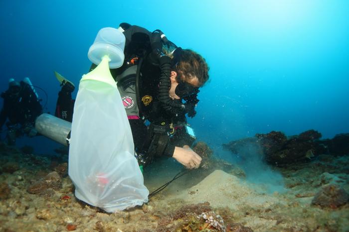 Tali Mass is an experienced diver. Here she is securing the nets to collect planula larvae after the corals have spawned.