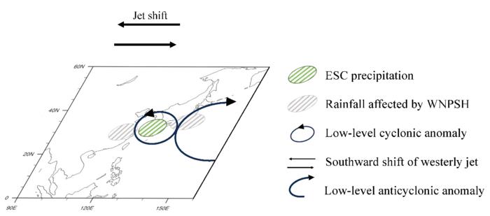It is well known that the East Asian subtropical rainy belt is typically situated along the northern flank of the WNPSH, stretching from the middle–lower reaches of the Yangtze River basin (YRB) eastward to southern Japan. Therefore, the interannual variability of this rainy belt is significantly affected by the zonal shift of the WNPSH. Despite the ECS being situated between the YRB and southern Japan, the WNPSH cannot induce precipitation anomalies over this area, implying that the ECS precipitation has its own uniqueness.