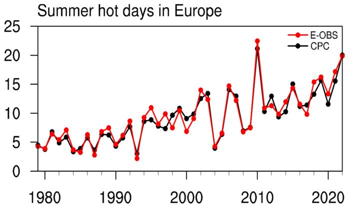 Time series of summer hot days in Europe derived from the Climate Prediction Center (CPC) and E-OBS datasets.