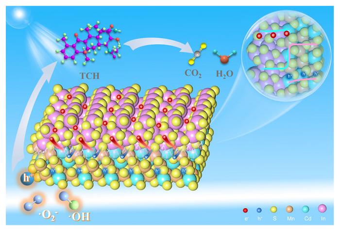 A novel S-scheme Mn0.5Cd0.5S/In2S3 photocatalyst efficiently degrades antibiotic pollutants in water. Its unique electron transfer mechanism enhances charge separation, boosting performance. The catalyst demonstrates high efficiency across various water types and excellent stability in a continuous-flow system. Toxicity assessments confirm the degradation process renders antibiotics harmless. This research provides a sustainable and effective strategy for combating antibiotic contamination, paving the way for advanced water purification technologies.