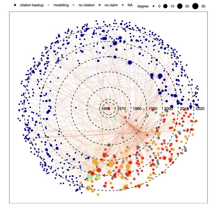 Belief in the claim that irrigation agriculture is responsible for 70% of all freshwater withdrawals, as a function of time in polar coordinates. The size of the nodes (documents) correspond to their degree; that is, the number of incoming edges (citations). Blue nodes (“citation backup”) denote documents that make the claim and support the claim with a citation. Green nodes (“modeling”) represent documents that produce original data supporting the claim through a modeling or statistical exercise. Orange nodes (“no citation”) are documents that make the claim but do not produce original data nor cite any study to support the claim. Red nodes (“no claim”) are documents that are cited to support the claim but do not actually make the claim. Grey nodes (“NA”) represent documents that are cited as making the claim but that we have been unable to access.