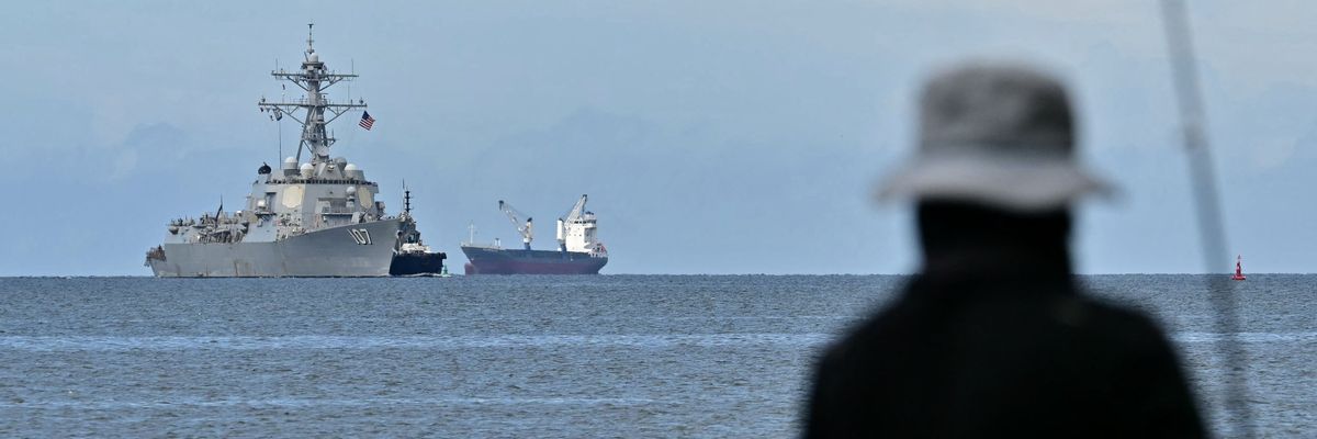 The USS Gravely warship is seen at a distance off the coast of Port of Spain, Trinidad and Tobago on October 26, 2025, as a fisherman looks on.