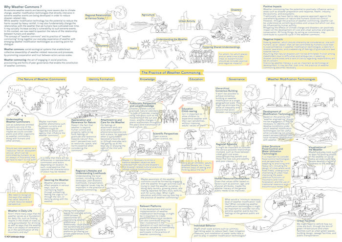 This diagram is based on a series of facilitated online workshops in 2023-2024 with 15 experts from diverse disciplinary backgrounds such as engineering, law, commons, geography, art and public governance. It is intended to be a tool for imagining, sharing, and developing the concept of weather commons with diverse stakeholders by visualizing the scope of what a “weather commons” could comprise. All elements are interconnected and interrelated, an assemblage which comes together to form the concept of weather commons.