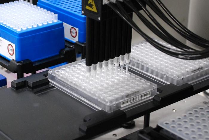 Dispensing DNA solution into a 96-well plate using a liquid handling robot.