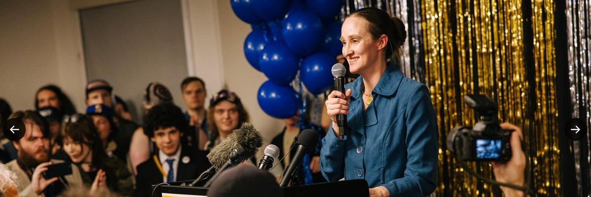 Katie Wilson addresses supporters at an Election Night party on November 4, 2025 in Seattle.