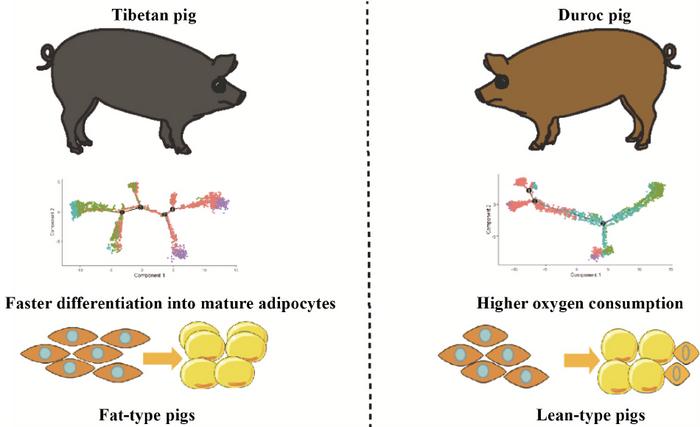 This study revealed the cellular heterogeneity of porcine adipose tissue and its relationship with fat deposition through single-cell sequencing technology. It clarified that Tibetan pigs already possess stronger adipogenic potential in the early stages of adipocyte development, and the enhanced fatty acid transport activity of mature adipocytes is the key to their efficient fat deposition. Additionally, the lower metabolic activity and oxygen consumption of Tibetan pig adipocytes may be adaptive manifestations to the hypoxic plateau environment. These findings provide a new cellular and molecular mechanism for understanding the differences in fat deposition among pig breeds and offer guidance for improving fat content and stress resistance in pig breeding.