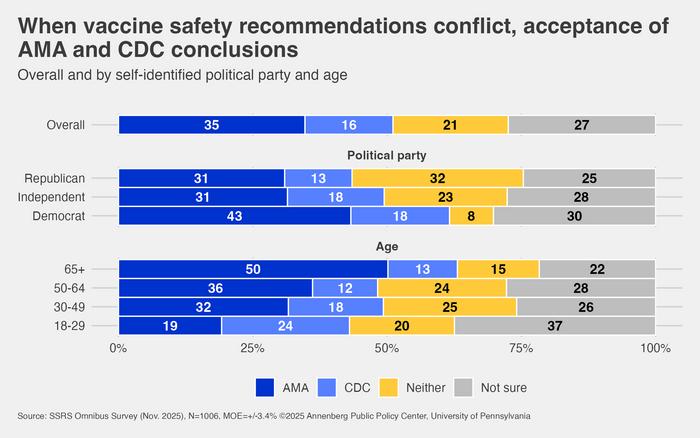 The percentage of the public that would be likely to accept the recommendations on vaccine safety of the Centers for Disease Control and Prevention (CDC) and the American Medical Association (AMA), including breakdowns by political party identification and age. Source: Annenberg Public Policy Center, from the SSRS Omnibus Survey Nov. 21-24, 2025.