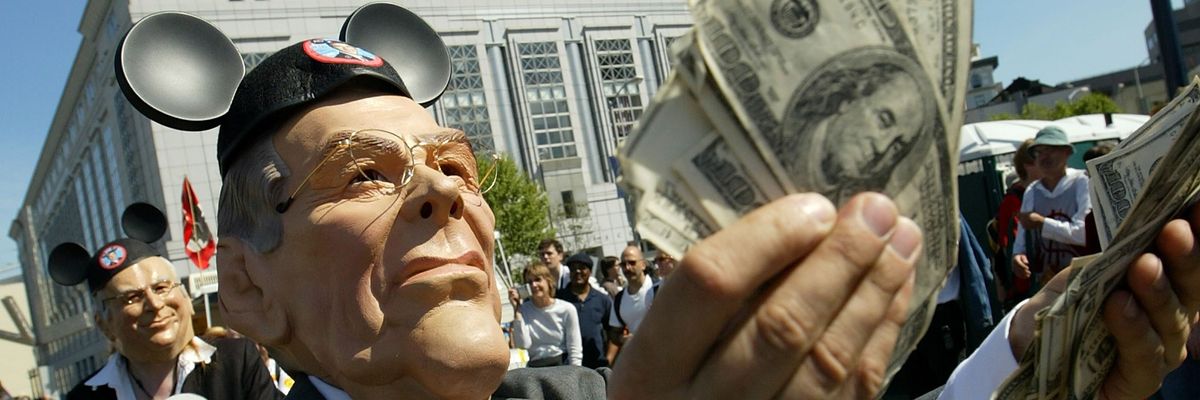 A man wearing a Donald Rumsfeld mask holds $100 bills during an anti-war demonstration to mark the one-year anniversary of the Iraq war March 20, 2004 in San Francisco, California.