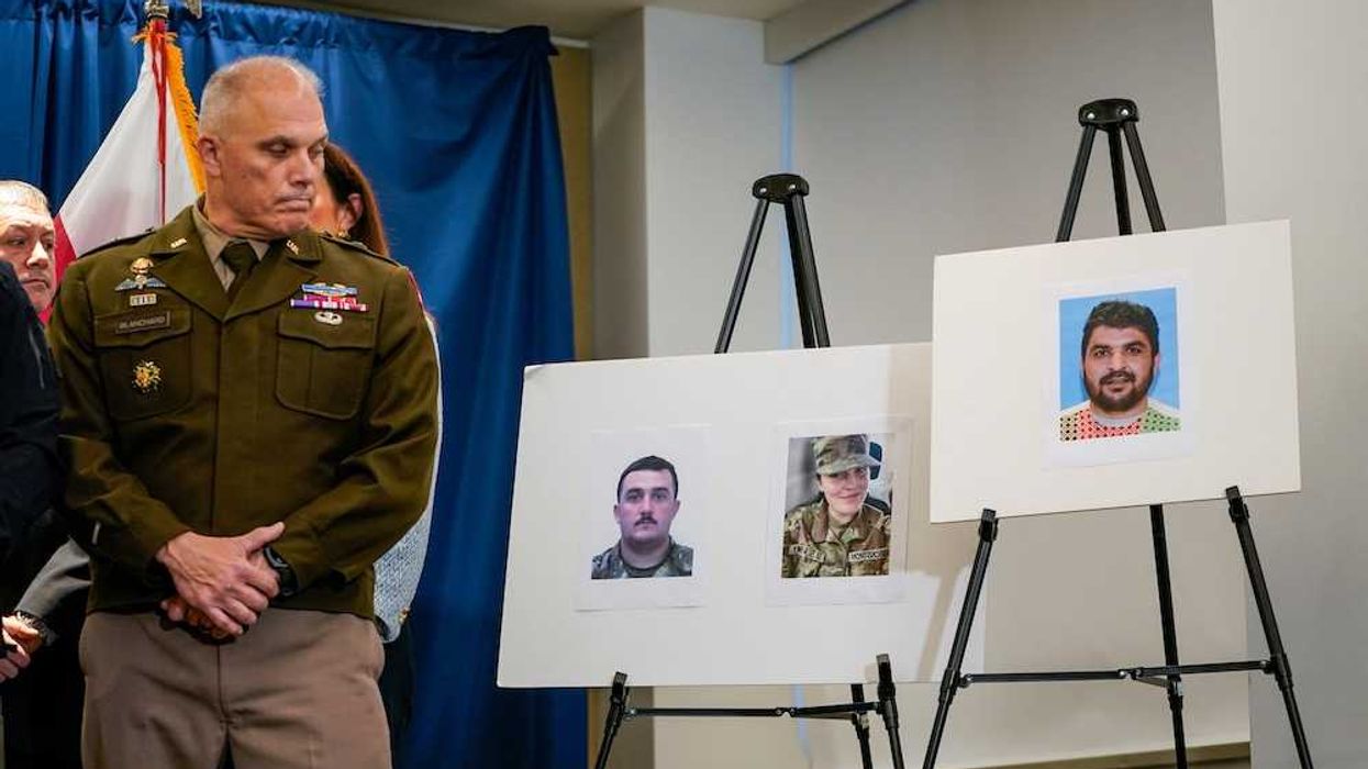 Brigadier General Leland D. Blanchard II looks towards pictures of two National Guard members who were shot in Washington on November 26, along with a picture of a suspect, Afghan national Rahmanullah Lakanwal, at a press conference with FBI Director Kash Patel, attorney Jeanine Pirro and other authorities in Washington, D.C., U.S., November 27, 2025. REUTERS/Nathan Howard