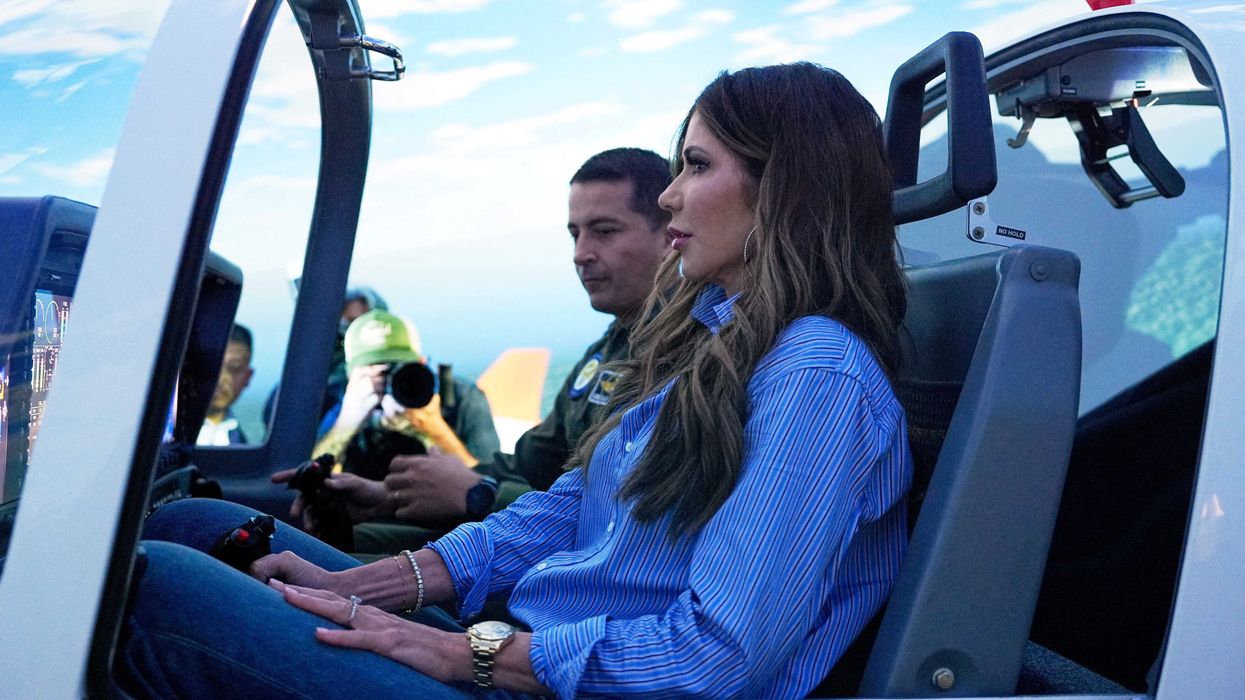 U.S. Homeland Security Secretary Kristi Noem participates in a flight simulator, as she tours Ulpiano Paez Air Base, Thursday, Nov. 6, 2025, in Salinas, Ecuador. Alex Brandon/Pool via REUTERS