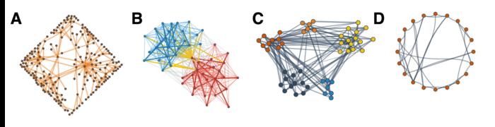 Networks generated by LLM agents exhibiting “preferential attachment” (panel A), “triadic closure” (panel B), “homophily” (panel C), and “small-world” dynamics (panel D).