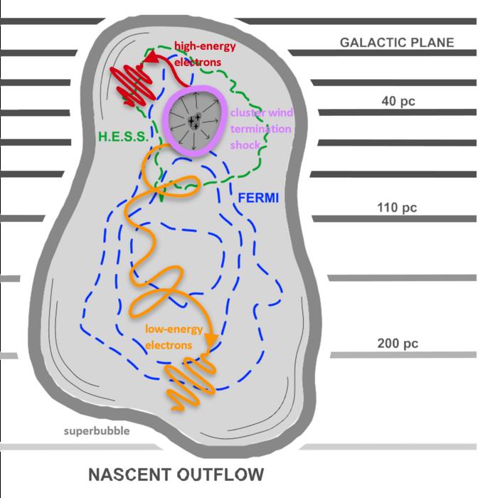 Fig. 3: Sketch depicting the interpretation of the measurements. Cosmic-ray electrons are accelerated at the cluster wind termination shock (pink). High-energy electrons lose their energy quickly and emit the TeV gamma-ray emission measured with H.E.S.S.. Lower-energy electrons are transported along the nascent outflow and generate the GeV gamma-ray emission detected with Fermi-LAT.