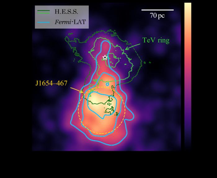 The study reveals the existence of a new GeV gamma-ray source. Surprisingly, the new source is offset from the TeV gamma radiation found around the cluster – precisely into the direction of the tail-like structure but about 320 light years away. “However, because the GeV and TeV emission are connected smoothly in terms of their spatial appearance and their energy spectra, we believe that they share a common origin”, explains Prof. Marianne Lemoine-Goumard from the university of Bordeaux, first author of the study.