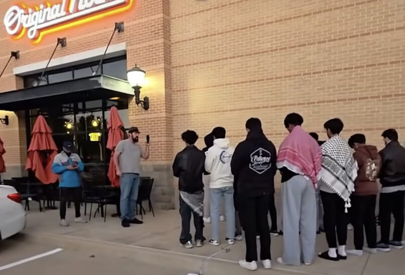 Three men disrupt Muslim teenagers offering their evening prayer outside the Original Mocha coffee house in Murphy, Texas. (Video screen grab)