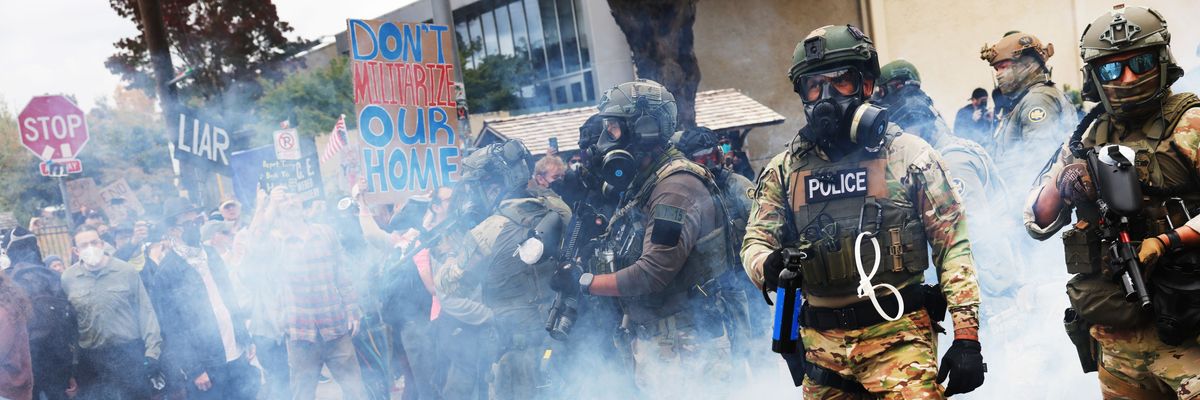 Federal agents, including members of the Department of Homeland Security, the Border Patrol, and police, clash with protesters outside a downtown U.S. Immigration and Customs Enforcement (ICE) facility on October 04, 2025 in Portland, Oregon.