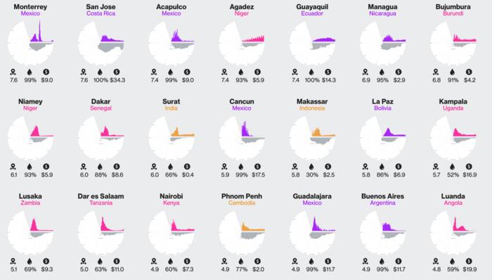 In the visualization, we see over 100 cities in the Global South and their sparseness, a measure of how the population is distributed across the cities, as well as access to clean water and water tariffs.