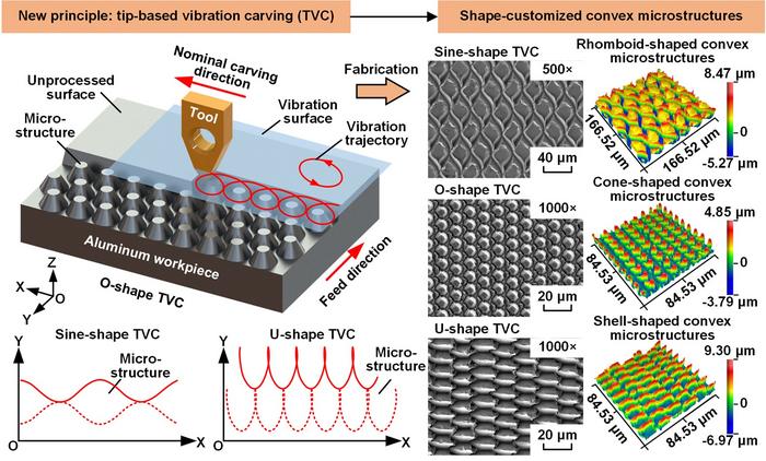 In International Journal of Extreme Manufacturing, researchers at Tsinghua University have introduced a novel tip-based vibration carving (TVC) methods to create tiny and custom-shaped bumps, known as convex microstructures, on material surfaces. These structures can change how a surface interacts with environments, making them important in applications such as heat exchangers, anti-icing coatings, sensors, and water-repellent materials.
