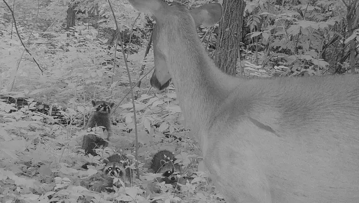 A black-and-white trail cam image shows three raccoons looking at a white-tailed deer in Forest Park.