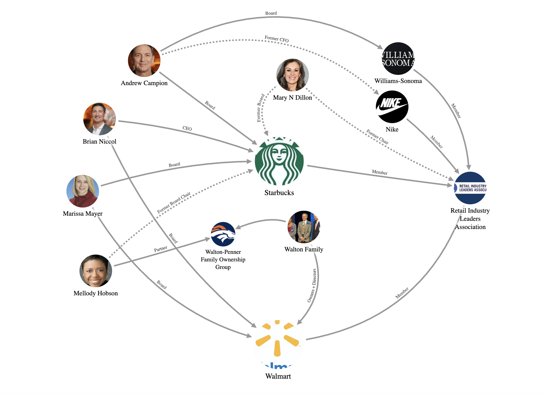 Both Walmart and Starbucks are RILA members, and Starbucks current and historic ties to RILA run deep. Former Starbucks board director Mary Dillon is the former chair of RILA. Additional companies represented through Starbucks board, like Nike and Williams-Sonoma, are also RILA members.