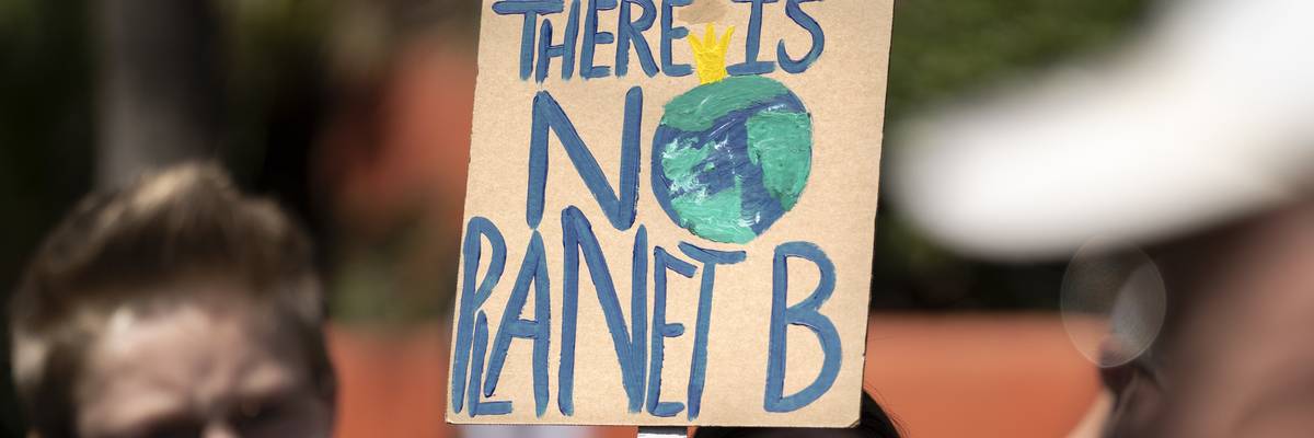 A protester is seen during a climate change demonstration holding a placard that says,” There is no planet B.”