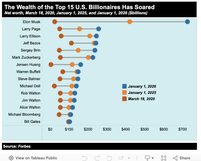 On March 18, 2020, for example, Elon Musk had wealth valued just under $25 billion. A little over five years at the end of 2025, Musk’s wealth is $726 billion, a dizzying 2,800 percent increase from before the onset of the pandemic.