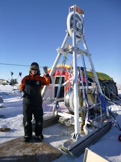 Instruments being deployed through the ice shelf borehole – Mike Brewer is monitoring the lowering rate. Stevens/NIWA/K061, CC BY-NC-ND