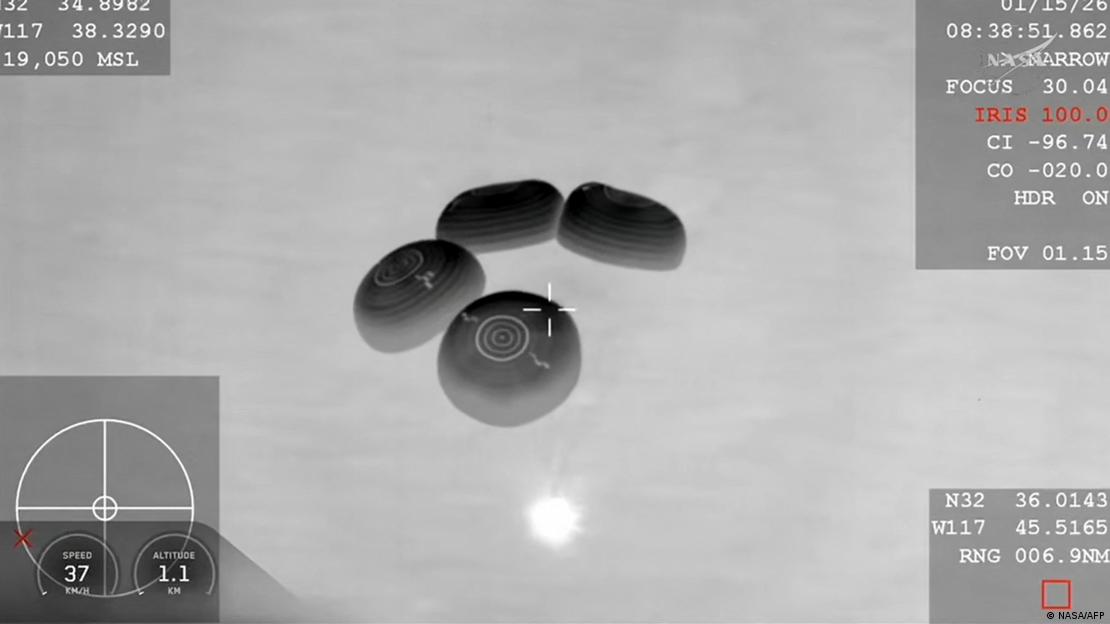 A joint NASA-SpaceX webcast presented live infrared video showing the deployment of two sets of parachutes from the nose of the free-falling capsule. The parachutes slowed the capsule's descent rate to about 15 miles per hour (25 kilometers per hour) before it gently hit the water.