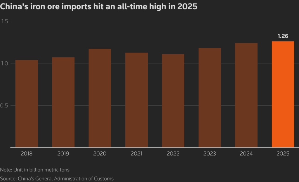 Global iron ore supply is forecast to grow by 2.5% in 2026, and shipments to China are expected to increase by between 36 million and 38 million tons, piling pressure on prices this year, said Bai Xin, an analyst at consultancy Horizon Insights.