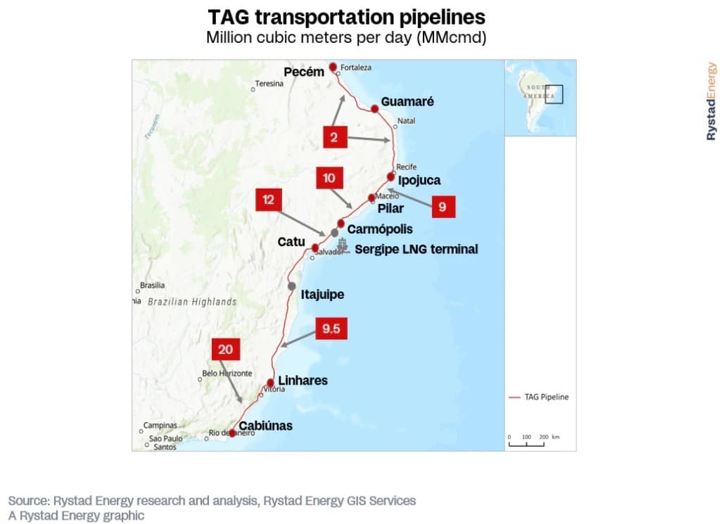 Since 2024, TAG has been connected to Eneva’s LNG terminal in Sergipe (point L) via a dedicated pipeline, adding a private LNG entry point to the grid. The $65 million project improves short-term supply flexibility in the Northeast and gives Eneva’s Porto de Sergipe I power plant the option to switch between LNG and grid gas based on pricing.
