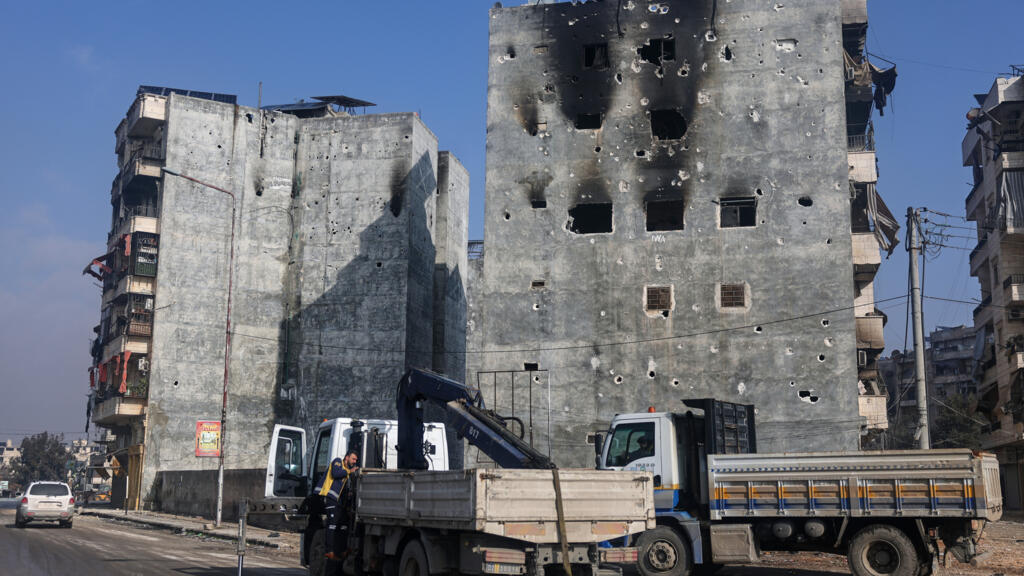 Syrian municipal workers near damaged residential buildings in the Achrafieh neighborhood of Aleppo, Syria, on Friday, January 9, 2026. © Ghaith Alsayed, AP