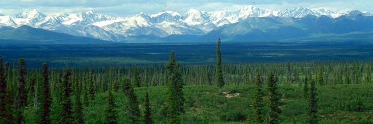White spruce taiga is seen in the Alaska Range of Alaska, United States.