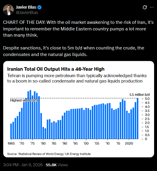 Ogorodnikov described the oil production data for Iran from the Energy Institute, also shared by Bloomberg writer Javier Blas above, which he characterised as revealing about Washington's motivations. Blas himself raised eyebrows with the January 9 X social media post, writing, "It's important to remember the Middle Eastern country pumps a lot more than many think."