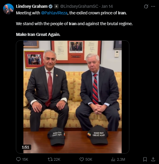 The analyst suggested this success explains "why Uncle Sam suddenly decided to 'make Iran great again'," with previous neocon warhawks like Lindsey Graham becoming recently obsessed with the former crown prince of Iran's push to topple the Islamic Republic (see tweet below). Also, note the baseball caps.