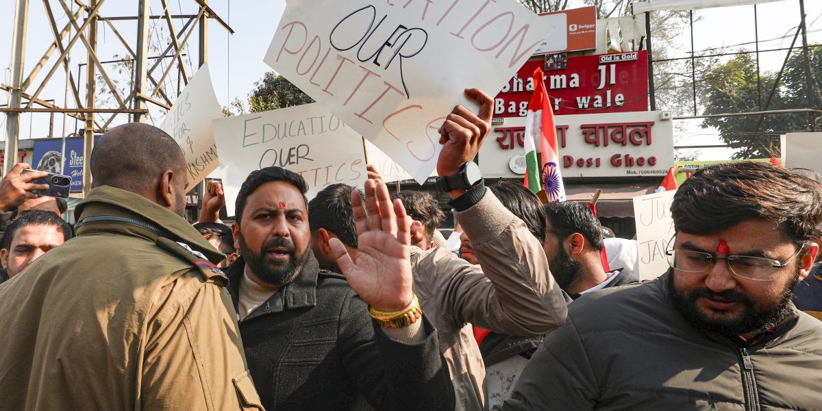 Student wing of the National Conference hold placards during a protest against the withdrawal of the permission letter for Shri Mata Vaishno Devi Medical College, in Jammu, Saturday, Jan. 10, 2026. Photo: PTI