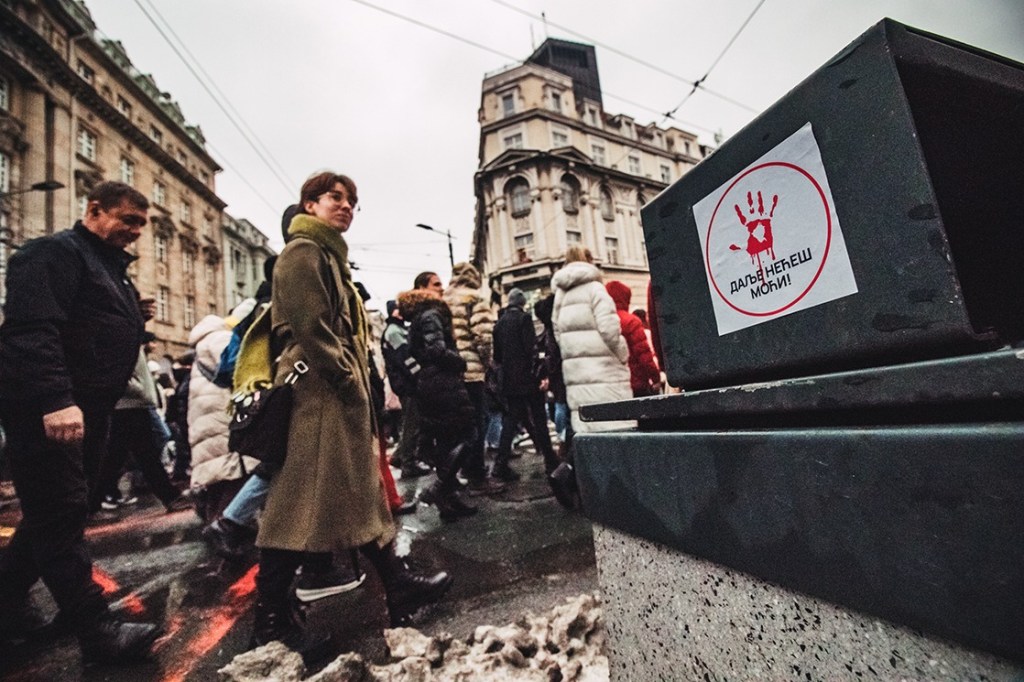 One message in particular – ‘Ruke su vam krvave’ (Your hands are bloody) became the defining symbol of the movement. Paired with red handprint imagery, it marked both a memorial to the victims and a direct accusation against those in power. Chanted at vigils and painted across public spaces, the phrase captured the moral clarity and uncompromising stance that Gen Z brought to the protests.