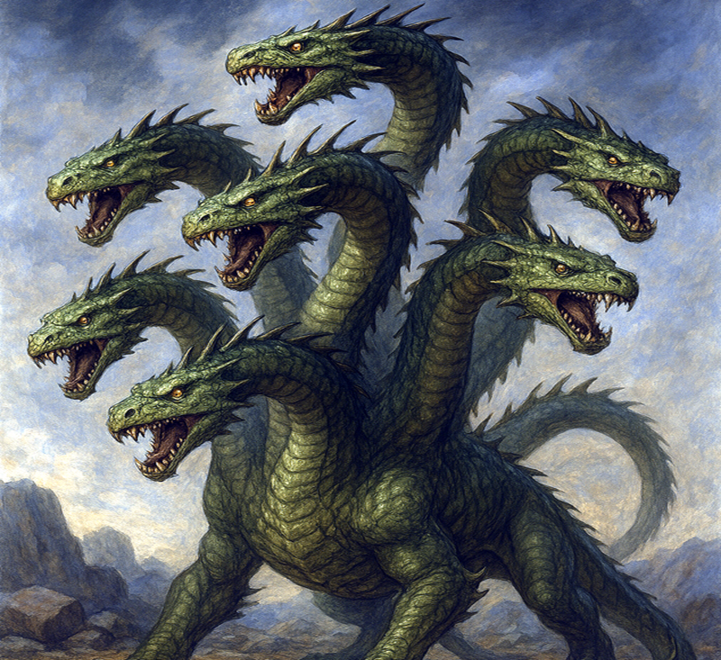 In ancient Greek mythology, the Hydra was a dangerous nine-headed serpent that attacked humans and animals alike. Any time one of its heads was cut off, another two would grow back. The legendary hero Heracles slew the monster by cutting off its heads and having his nephew Iolaus cauterize each of the wounds.
