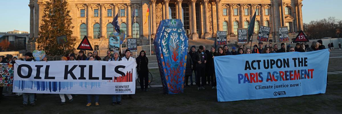 Activists stand with a coffin to symbolize the dying of coral reefs in Berlin, Germany on December 12, 2025, a decade after the signing of the Paris Agreement.