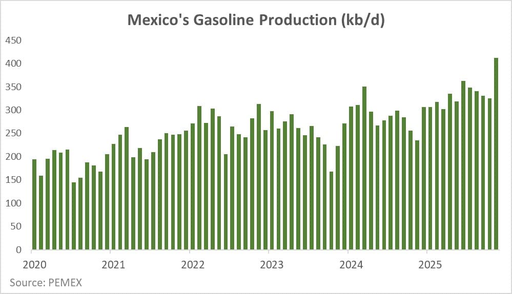 Looking ahead, Mexico’s two most prominent refining assets will be the new Dos Bocas refinery, which is already delivering the largest gains in domestic production, and the Tula refinery, where long-delayed modernization could unlock the system’s next step-change. By November 2025, Dos Bocas was running at 61% utilization, processing 206,800 b/d, signalling that both of its 170,000 b/d distillation units have been operating already. Gasoline output, which weakened over the summer following repeated power outages, rebounded sharply in autumn, reaching 89,200 b/d in November.