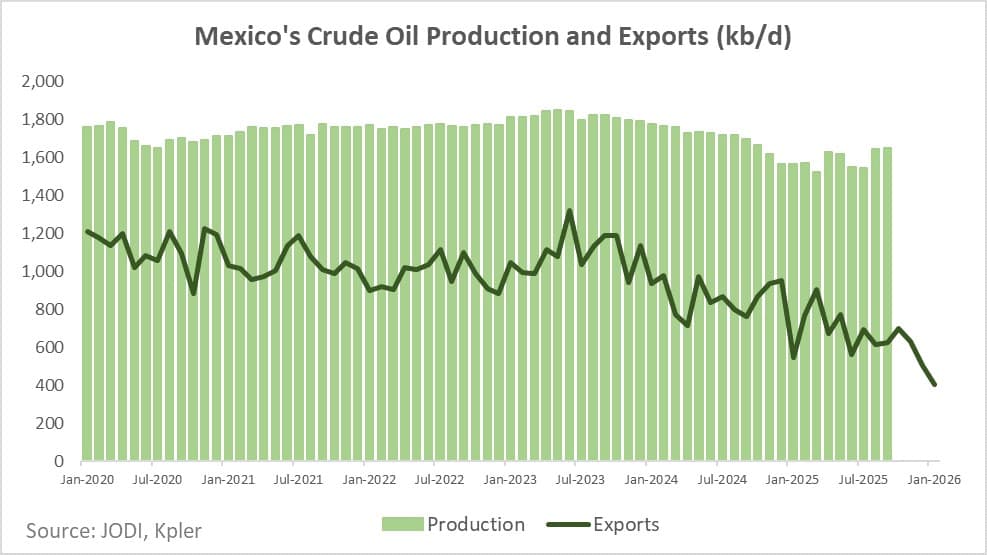 - Mexico’s crude exports have fallen from around 1.1 million b/d in 2020 to 503,000 b/d in December 2025 – the lowest level in the 21st century, while production has declined far less, signalling a shift toward domestic refining.