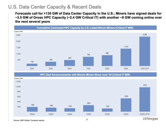 J.P. Morgan estimates that converting existing mining power capacity to HPC applications could cost roughly $10-15 million per megawatt before GPUs, with all-in AI data center costs exceeding $45 million per megawatt once hardware is included. That math explains why expansion across the sector is gravitating toward sites that already work, rather than projects that still need power.