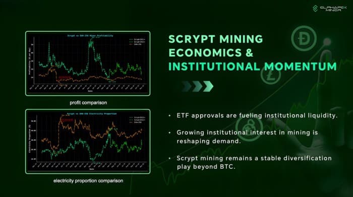 Datacentrex’s current revenue engine is Scrypt mining, a faster-growing and less saturated corner of crypto infrastructure that has outperformed expectations over the past cycle.
