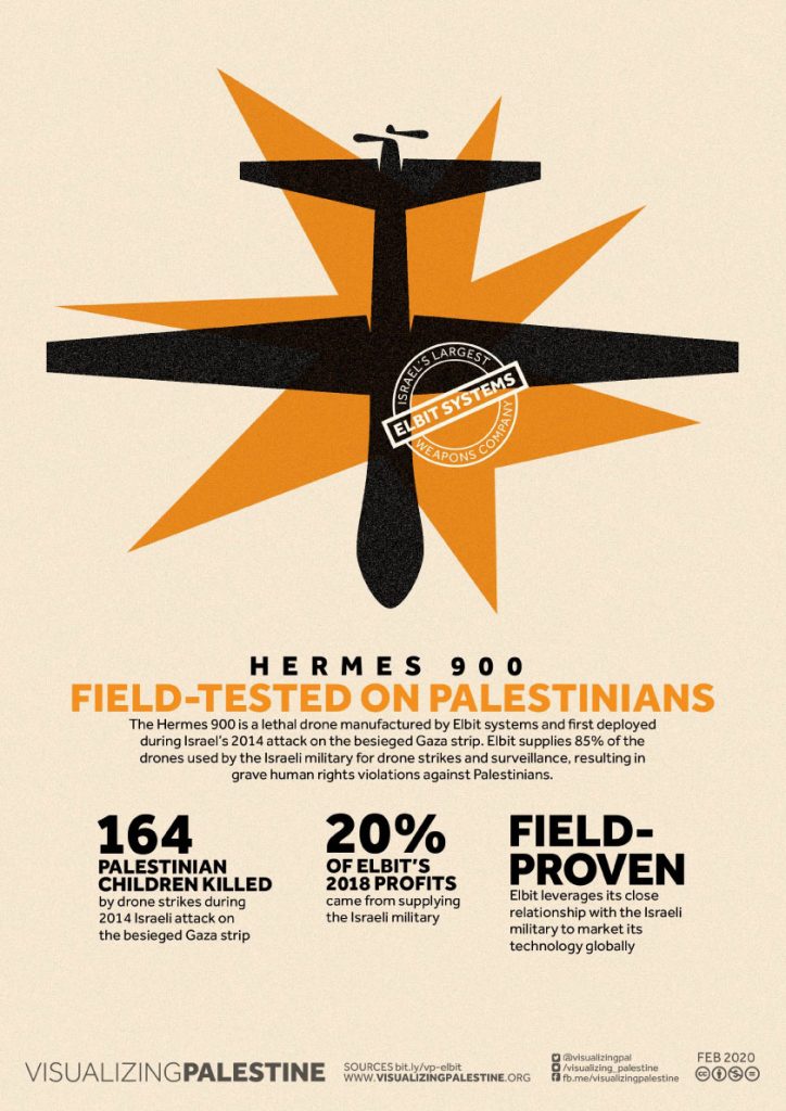 Elbit markets its military hardware and software to regimes engaged in violent repression worldwide, with weapons tested in assaults against Palestinians seeing a spike in global demand. Canada has awarded over $44 million in contracts to Elbit, procuring the company’s Hermes 900 Starliner aerial drone in 2020 and hiring Elbit to support an airspace monitoring project in 2021.