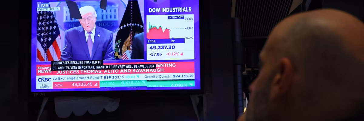 President Donald Trump’s press conference on tariffs is displayed on a television as traders work on the floor of the New York Stock Exchange on February 20, 2026 in New York City.