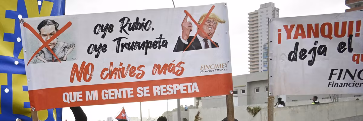 Cubans hold a banner against US President Donald Trump and Secretary of State Marco Rubio during an “Anti-Imperialist” protest in front of the US Embassy against the US incursion in Venezuela, where 32 Cuban soldiers lost their lives, in Havana on January 16, 2026.