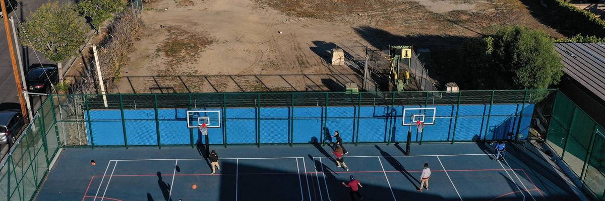Children play basketball beside an oil well pump jack and tank, in the Wilmington neighborhood of Los Angeles, California, on February 24, 2022.