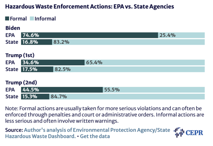 In particular, data for compliance and enforcement activities conducted under the 1976 Resource Conservation and Recovery Act (RCRA) for hazardous waste handlers show a large gap in the number of formal actions taken between Biden and Trump (see figure below).
