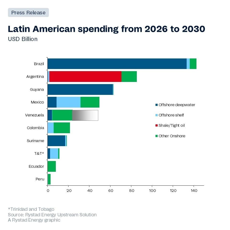 Argentina, Guyana, and Brazil are poised to lead Latin American oil production growth in 2026, even though the possible return of Venezuelan barrels poses questions for the region’s long-term capital expenditure strategy. While the supermajors continue to flag Venezuela as difficult to underwrite on a long-term basis, traders and players like Trafigura and Hillcorp are increasingly drawn to near-term, structured opportunities in the country, signaling a possible rebalancing of portfolios. Although legal uncertainties persist and institutional legitimacy remains thin, recent reforms, such as the lifting of sanctions and the overhaul of Venezuela’s hydrocarbons law, reinforce US efforts to market Venezuelan barrels. Rystad Energy analysis estimates that flagship projects in Argentina, Guyana and Brazil, which are expected to add more than 700,000 barrels per day (bpd) of oil production this year, will continue to outcompete Venezuela through at least 2030. In the short term, 300,000 bpd of Venezuelan supply could be added to the market, but the likelihood of shifting investment from current Latin American powerhouses to beleaguered Venezuelan infrastructure amid an uncertain business environment remains limited.