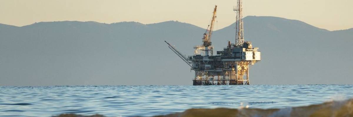 An offshore oil platform with Santa Cruz Island in the background is seen in Santa Barbara Channel, California.