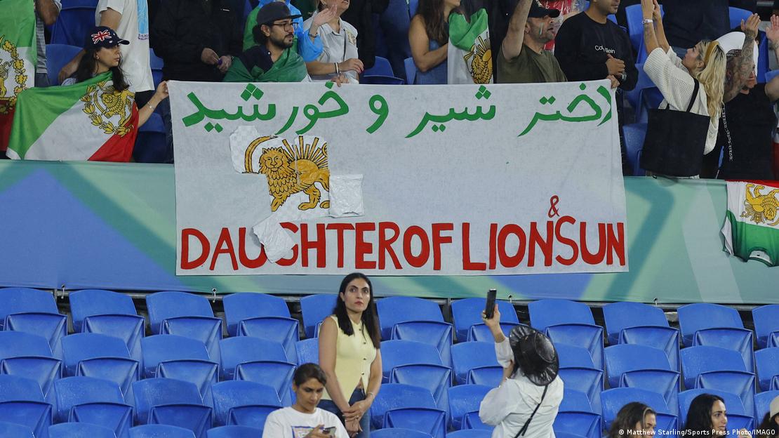 Local fans held banners in support of the protests against the Iranian regime