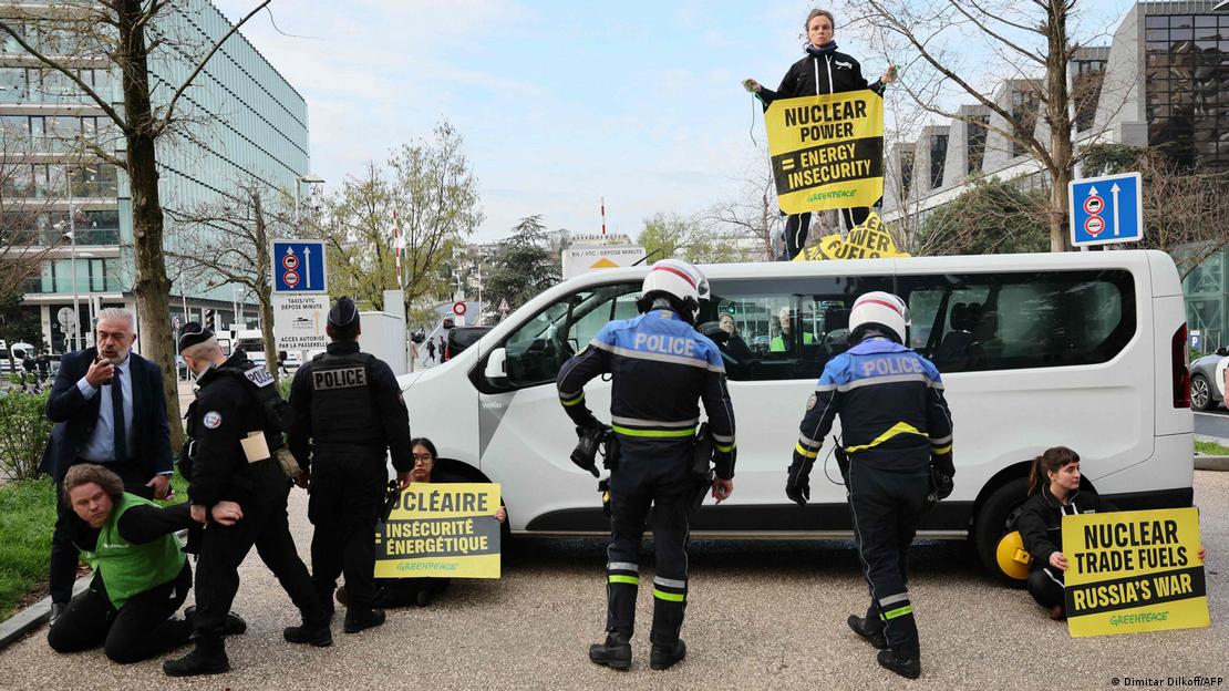 Two Greenpeace activists stormed the stage at the start of the summit, interrupting Macron and International Atomic Energy Agency chief Rafael Grossi as they were greeting heads of state.